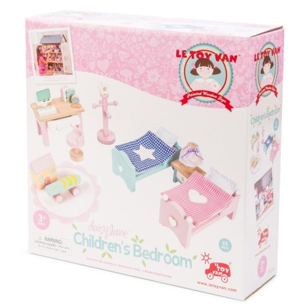 Vytvořte si doma pohádkové místo k odpočinku postaviček, a to s tímto malovaným dřevěným setem nábytku. Velikostně se hodí do dřevěných domků pro panenky od Le Toy Van. Dvě postele jsou kompletní s vakuši a peřinami, najdete zde také noční stolek s lampičkou a věšák na oblečení. Stůl s židlí je ideální pro studium, v balení jsou dokonce i PC a knihy! Další vybavení z řady Daisylane naleznete v našem sortimentu. Všechny hračky firmy Le Toy Van jsou vyrobeny s cílem – aby dlouho vydržely. Designováno s láskou zkušenými řemeslníky za použitých etických praktik a udržitelných materiálů, které jsou laskavější k naší planetě. Hlavní vlastnosti: Vyrobeno eticky z udržitelných materiálů. Kompatibilní s ostatními produkty z řady Daisylane. Vyrobeno eticky z udržitelného dřeva. Testováno podle nejpřísnějších standardů. Malováno netoxickými barvami. Prestižní kolekce domečků pro panenky a doplňků firmy Le Toy Van. Před více než 25 lety zakladatel Georges navrhl svůj úplně první domeček pro panenky, stavební kámen této firmy. Vyrobeno eticky z udržitelných materiálů, dřevěné domky pro panenky Daisylane jsou jedinečné a rozvíjejí dětskou představivost. Rodinné dědictví, skutečná investice do hraní.
