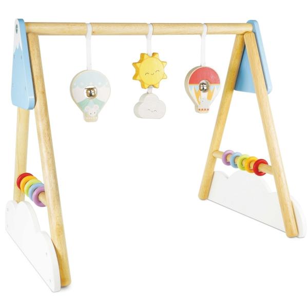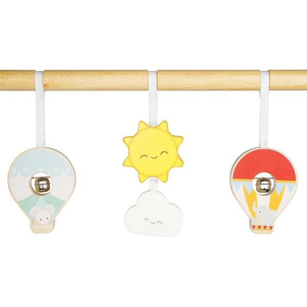 Rozkošná dětská hrazdička, která je stabilní, je vyrobena z přírodního kaučukového dřeva a má zaoblené hrany. Její dekorací je mrak, pohoří, barevné horkovzdušné balóny, které visí na textilní šňůrce. Hračky cinkají díky rolničkám. Na stranách…