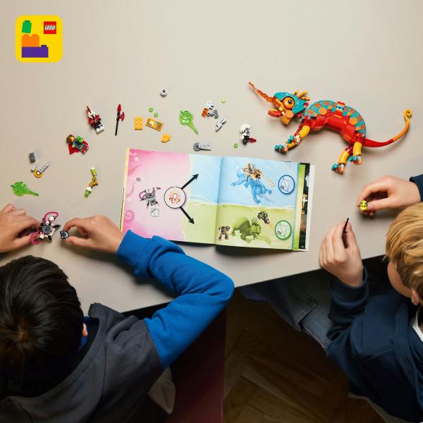 Malí snílci si užijí stavění figurky chameleona, kterého mohou poté přeměnit na 2 způsoby – mohou ho postavit jako strážce ohnivého chameleona s namontovanou blasterovou věží a 4 vystřelovači projektilů, nebo na rychlou stíhačku a mini robota. Chameleon má pohyblivá ústa, hlavu, ocas, oči a nohy. Obě verze modelu jsou plné parádních detailů včetně modulárních zesilovačů, které jsou kompatibilní s jinými stavebnicemi ze série LEGO® DREAMZzz™ z roku 2025 (prodává se samostatně). Minifigurky Matea a Zero, jakož i figurky Logana, Z-Bloba a Kybertvora vdechnou příběhům život a inspirují děti k tvořivým hrám.
