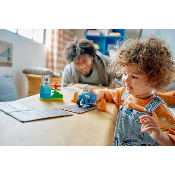 POLICEJNÍ HRAČKA NA KREATIVNÍ HRY – Malé děti si vymyslí zábavné příběhy o pomáhání v komunitě a využijí jemné motorické dovednosti, aby posadili policistku na motorku LEGO® DUPLO® a jezdili s ní kolem kuželů