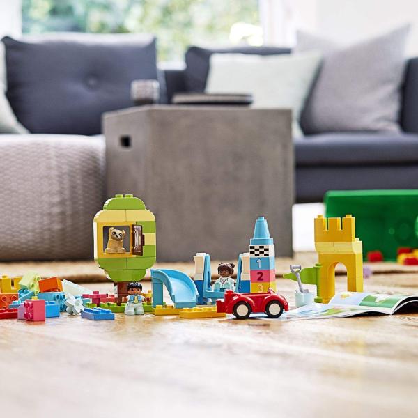 Barevná sada kostek, dílků, čísel a figurek je prakticky uložena ve žlutém úložném boxu s krytem ve stylu LEGO® DUPLO® kostky s 8 výstupky. Objevte ještě více zábavy v kombinaci s dalšími DUPLO soupravami.