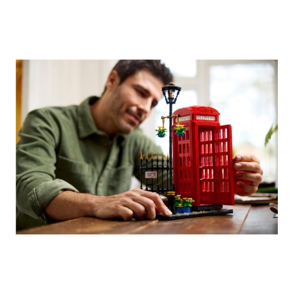 Tento sběratelský model telefonní budky ze série LEGO® Ideas pro dospělé se nachází v typicky londýnském prostředí se sestavitelnou dlážděnou ulicí, pouliční lampou a visícími květinami, květináčem a plotem a cedulkou s názvem ulice. Tento výstavní model lze přetvořit na stojan na mobilní telefon a poslouží jako krásná dekorace pro váš domov nebo kancelář.