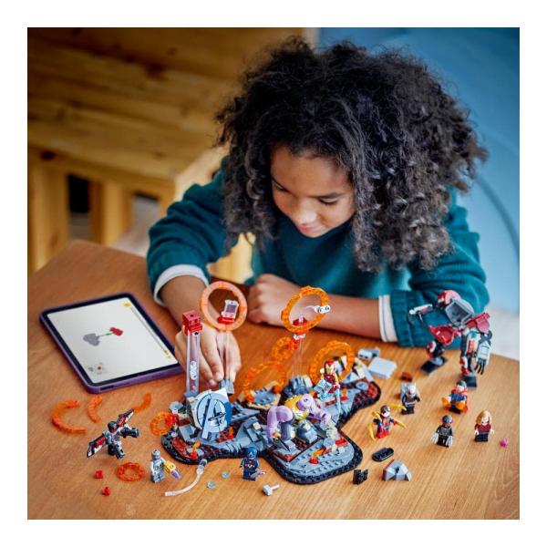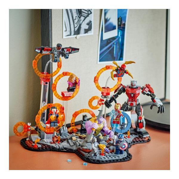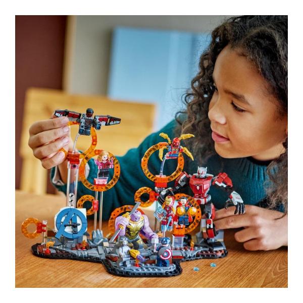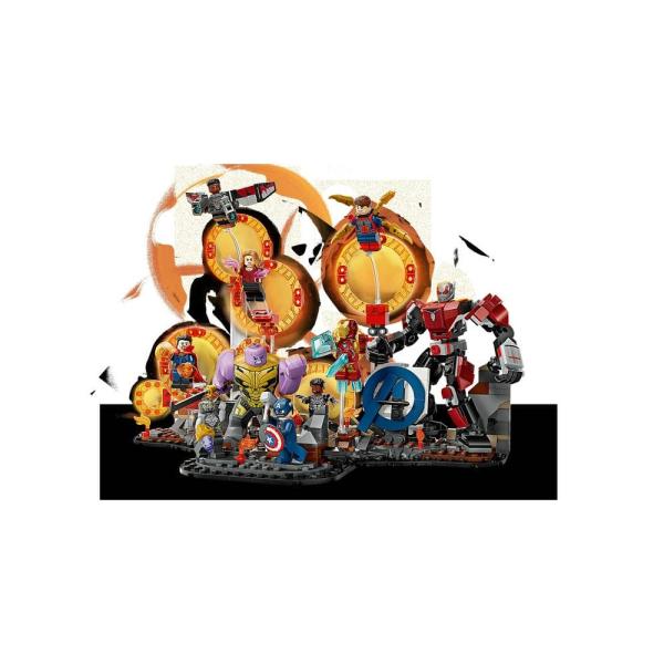 Tato stavebnice zobrazuje epické poslední zúčtování z filmu Avengers: Endgame od studia Marvel a najdete v ní interdimenzionální sling ring portály a 9 minifigurek: Captaina Americu (se štítem), Iron Mana MK85 (s mečem a štítem), Chitauri (s vystřelovačem na ruce), Ant-Mana, Scarlet Witch (s ohnivými prvky), Doktora Strangea, Iron Spidera (se 4 pohyblivými „nohami“ na zádech), Black Panthera a Falcona (s 2 vystřelovači projektilů). Velká figurka LEGO Thanosa, plně pohyblivý robot Ant-Man, dvě funkce vybuchování skal a možnost nekonečně si tuto stavebnici přestavět dávají dětem do rukou akci se superhrdiny v epických rozměrech. Model se skládá ze 621 dílků.