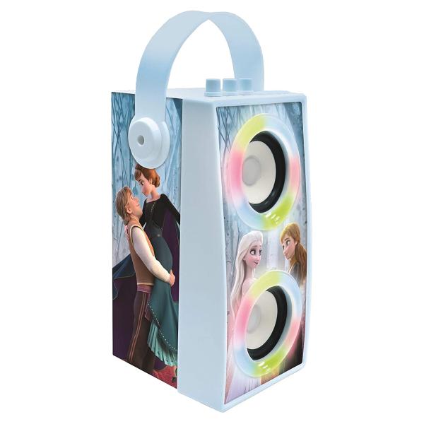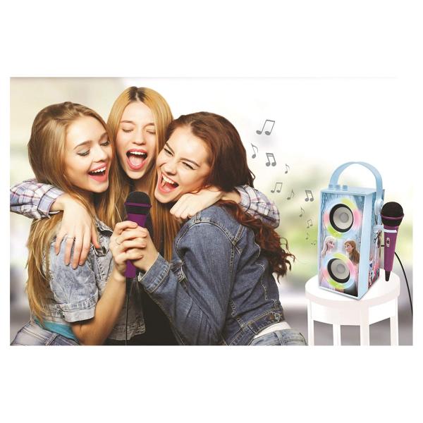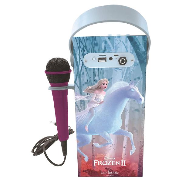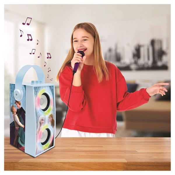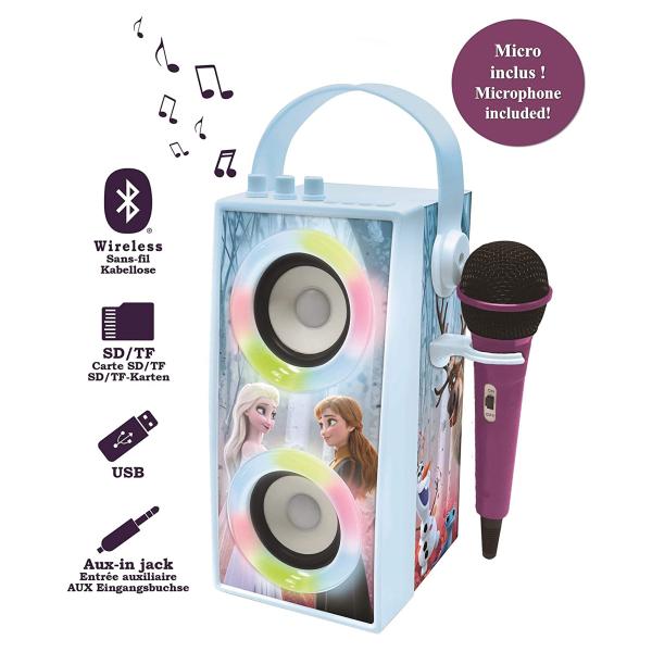 Objevte kouzlo hudby s reproduktorem Lexibook Ledové království! Ideální pro karaoke zábavu, lehký a výkonný, s Bluetooth® připojením a možností přehrávání z USB nebo micro SD karty.