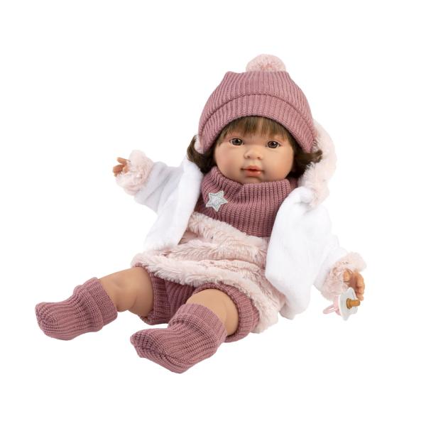 Hovící a plačící panenka (po vytažení pojistky ihned funkční) s měkkým látkovým tělem a s vlásky po celé hlavě. Hlava a končetiny jsou vyrobeny z kvalitního měkčeného vinylu.