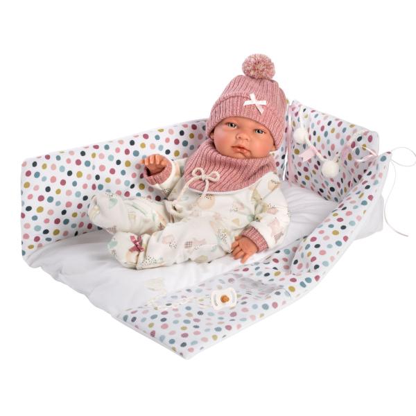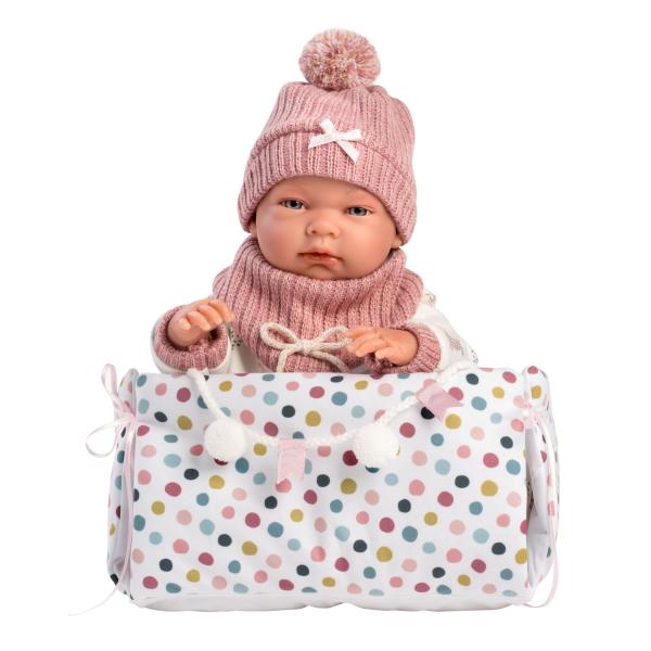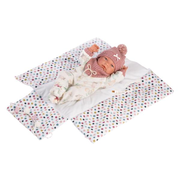 4dílná sada: 3 kusy oblečení a podložka s bambulkami přeměnitelná na hrací ohrádku pro panenku novorozeně Llorens velikosti 40–42 cm.