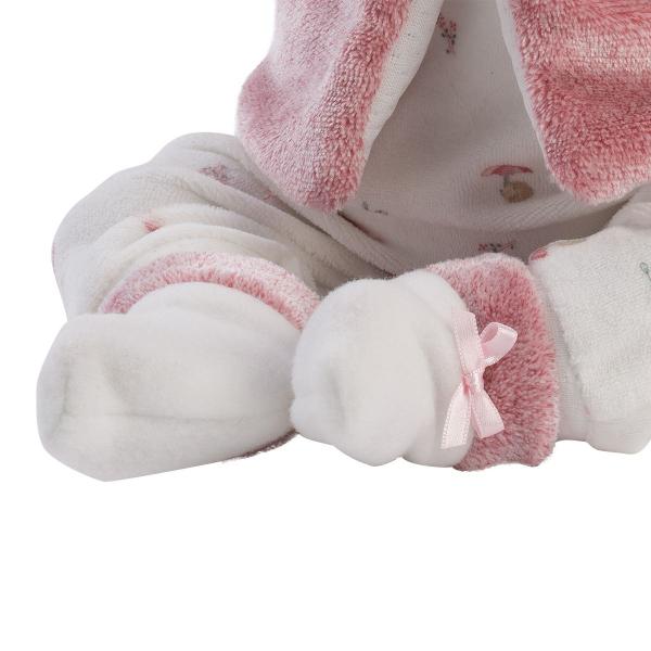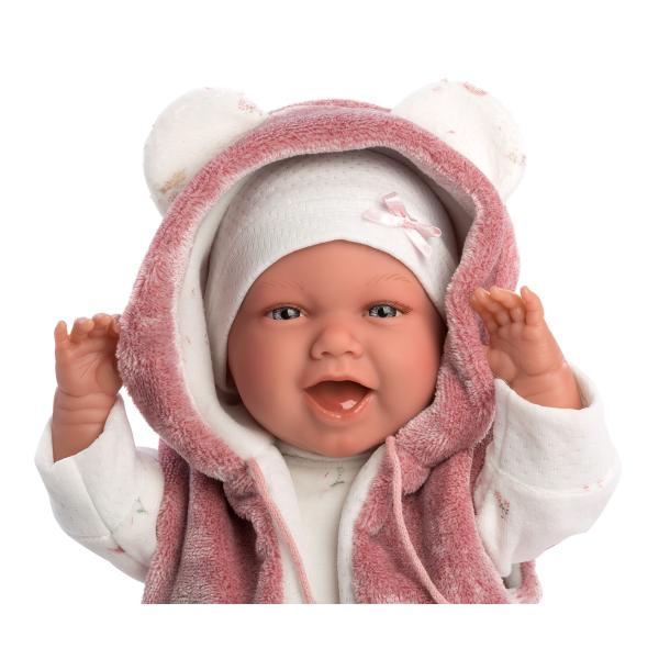 Realistická 42 cm panenka Llorens vyrobená ve Španělsku je jedinečnou hračkou pro děti všech věkových skupin. Mimi je oblečena do velurových kombinéz s potiskem lesních zvířat s deštníky, ponožkami příjemnými na dotek s kožešinou a mašličkami, jakož i s bílou čepicí a nadýchaným tílkem se špinavě růžovou kapucí. Romper jsou zapínány na zadní straně suchým zipem, což usnadňuje přebalování dítěte. Látkové bříško panenky je vyplněno měkkou podšívkou a když ji stisknete, panenka se začne smát. Každé dítě bude milovat tuto sladkou a usměvavou tvářičku. Mimi má roztomilé modré oči, dlouhé řasy a roztomilý malý nos. Oči jsou permanentně otevřené, nezavírají se. Ručky a nožičky jsou pohyblivé, takže panenku můžeme snadno rozložit, jak chceme. Panenka je zabalená v dekorativní kartonové krabici. Přiložený dudlík je ozdobný. Milujeme španělské panenky Llorens!