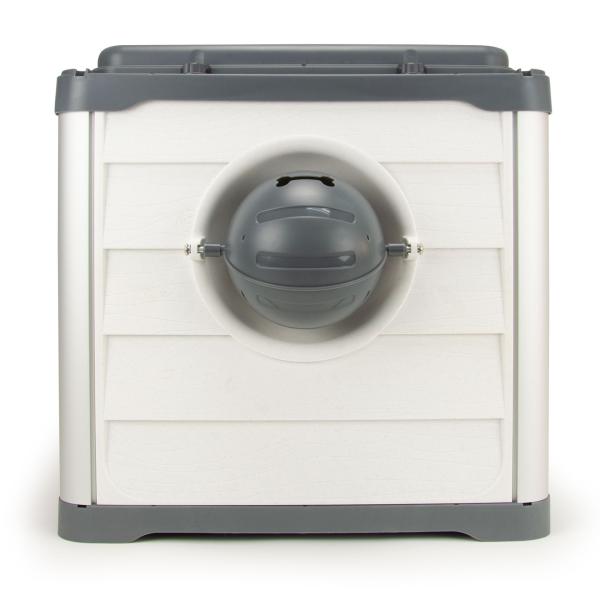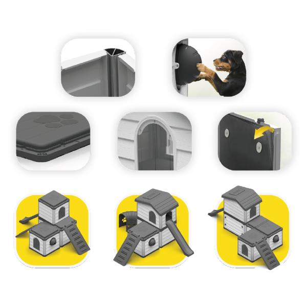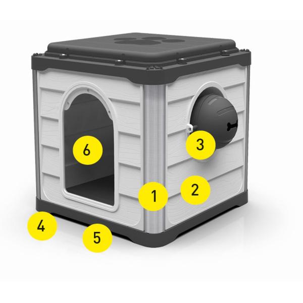 Popis produktu:1) Robustní rám z eloxovaného hliníku má enormní odolnost i kvalitu. Je navržen se zaoblenými tvary, aby ho váš mazlíček nemohl žvýkat. Stěny jsou spojeny pomocí kotvení ve tvaru „T“.2) 3 druhy modulárních stěn z polypropylenu smíchaného s ekologicky nezávadným bio masterbachom: stěna s vchodem, stěna s dávkovačem krmiva, 2 x stěna bez otvoru.3) Interaktivní dávkovač suchého krmiva, který inovativním a hravým způsobem přinutí vašeho psa jíst až 5x pomaleji než z běžné misky. Dávkovač intelektuálně stimuluje vašeho mazlíčka, protože pokud se zvíře chce dostat k jídlu, musí dávkovač packami pootáčet tak, aby z něj krmivo (pochoutky) vypadávaly otvorem ven. Dávkovač má kapacitu na celodenní dávku suchého krmiva.4) Vyvýšená vnitřní podlaha pro lepší izolaci před chladem.5) Drenážní drážky, které umožňují lepší odvod vody ven během mytí.6) Vstupní otvor, který je možné opatřit průhledným plastovým závěsem na ochranu před chladem a deštěm (v prodeji samostatně koncem roku).
