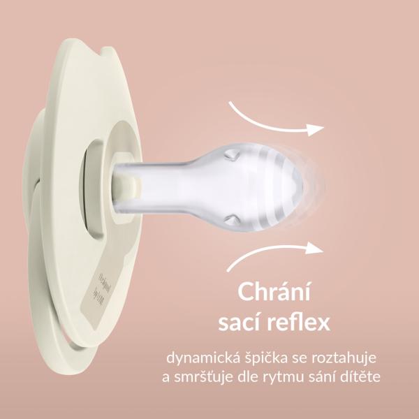 – Dynamický dudlík se díky unikátní konstrukci ze silikonu různé tloušťky natahuje a stahuje podle rytmu sání dítěte. Díky tomu chrání jeho sací reflex a nemá nepříznivý vliv na kojení. Symetrický tvar špičky vychází z tvaru bradavky naplněné mlékem, která poskytuje miminku známý pocit podobný pocitu z prsu.