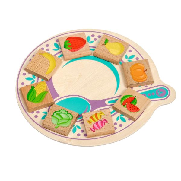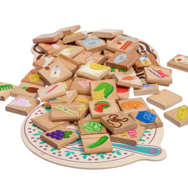 Dřevěná herní sada „jedlý – nejedlý“ je skvělá edukativní vývojová hra pro děti, která rozvíjí jejich chápání, znalosti a představivost. Sada obsahuje talíř se lžící vyobrazený na jedné dřevěné podložce, proutěný košík na druhé podložce a dále pak 56 dřevěných destiček s barevnými obrázky jedlých a nejedlých věcí. Všechny předměty jsou nakresleny veselými barvami, ale jasně a srozumitelně tak, aby je bez váhání rozpoznalo i malé dítě. Nabídka je velmi pestrá. Na kartičkách s obrázky jedlých věcí najdou děti ovoce, zeleninu, sladkosti, limonády, zmrzlinu, klobásy a jiné pochutiny. Na kartičkách s obrázky nejedlých věcí jsou například jehla, klíč, kolíček na prádlo, žárovka, zapalovač, tužka a spousta dalších. Cílem hry je umístit jedlé věci na talíř a nejedlé do košíku. Některé kartičky posunou děti v objevování světa ještě dál. Například obrázky hub, protože některé budou patřit na talíř do jedlých a jiné než třeba muchomůrka do košíčku k nejedlým věcem. Součástí hry jsou také 4 černobílé předlohy, na které mohou menší děti přikládat dřevěné obrázkové destičky a zahrát si tak například rychlou postřehovou hru. Po skončení hraní lze uložit obrázkové destičky do uzavíratelného lněného sáčku, který je součástí balení. Tato hračka je označována jako Montessori pomůcka. Rozměr dřevěných bloků 2,5 cm x 2,5 cm Pro děti od 3 let