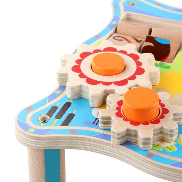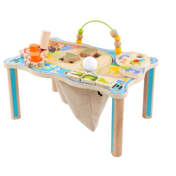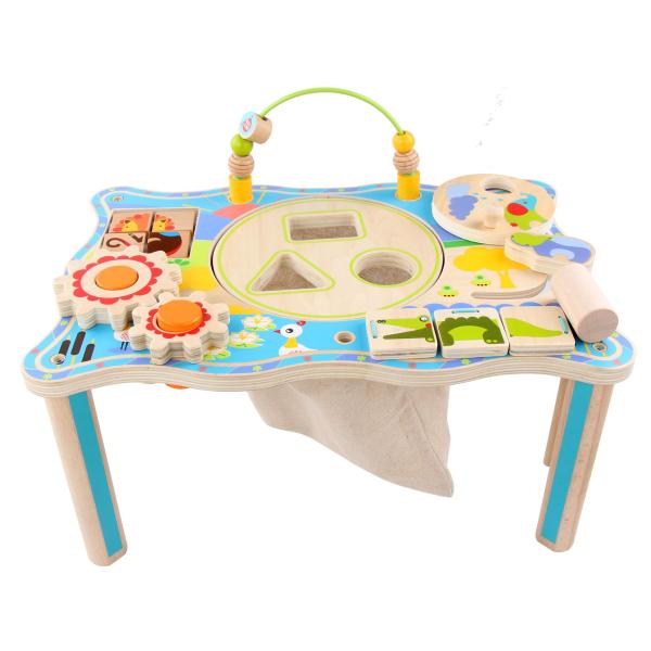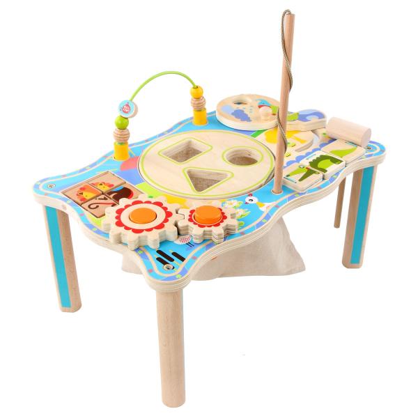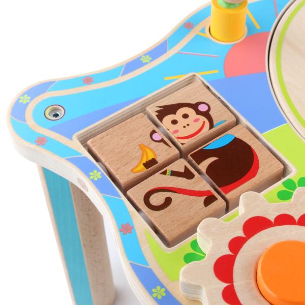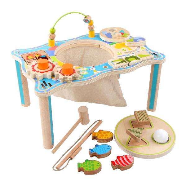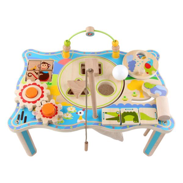 Dřevěný multifunkční stoleček je navržen tak, aby upoutal pozornost dítěte a vyvolal v něm zvědavost. Je zdoben barevnými obrázky z džungle a má mnoho interaktivních částí. Dřevěné ozubená kola se dají otáčet, korálky se mohou přesouvat po kolejnici, je zde umístěna i zatloukačka, barevné kostky a mnoho dalšího. Uprostřed stolečku je umístěno lněné sáček, ze kterého se dají udičky, na jejímž konci je magnet, chytat malé dřevěné rybky, které jsou také opatřeny magnetem. Tento otvor lze uzavřít poklopem, který je opatřen třemi otvory různých tvarů a slouží jako vkládačka. Aby 2 dvoudílné dřevěné vkládací prvky propadly do kapsy, je potřeba nimi správně pootočit. Tato víceúčelová hračka využívá řadu životně důležitých schopností dítěte a podporuje průzkumnou hru, na níž se může podílet několik hráčů a společně řešit různé hádanky. Délka stolečku 41,5 cm, šířka 27 cm, výška 21 cm. Průměr otvoru v stolečku 19 cm, průměr tvarů určených do otvoru cca 4 cm. Délka rukojeti udičky 24 cm, velikost rybiček 6,5 cm. Délka kladívka 18,5 cm.