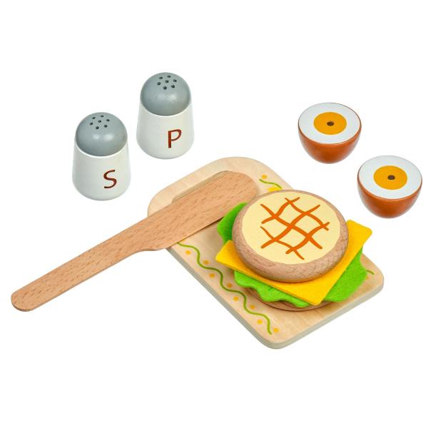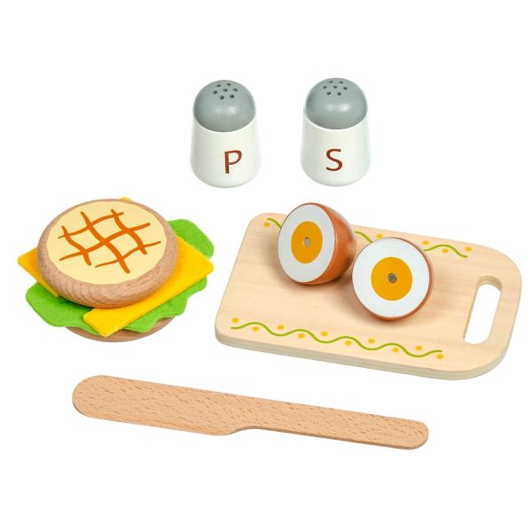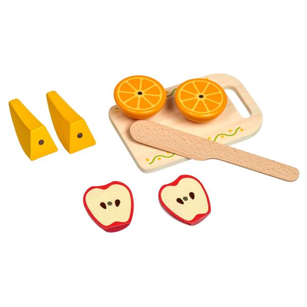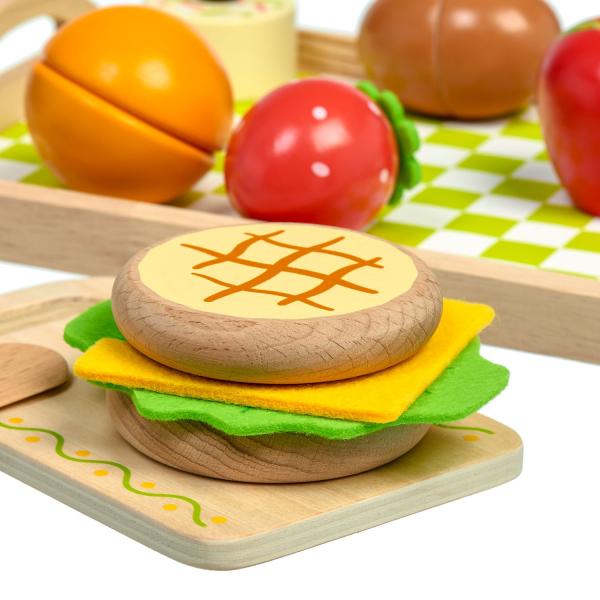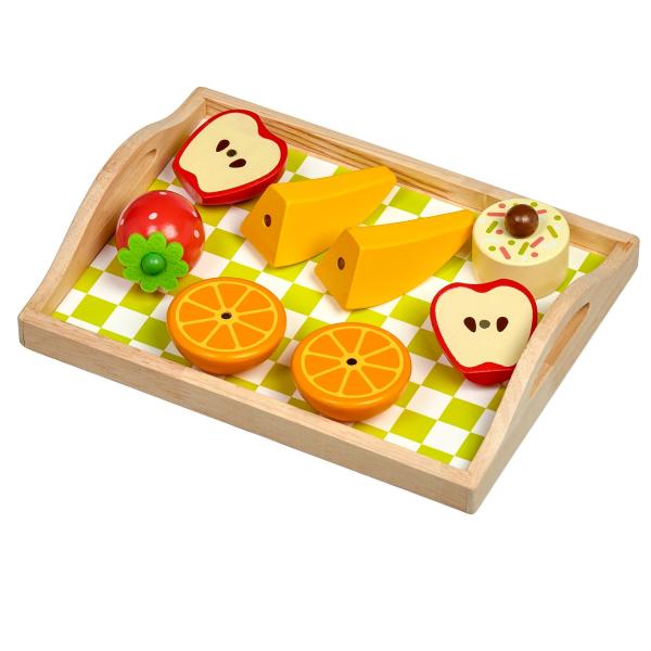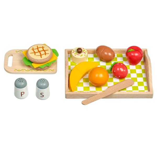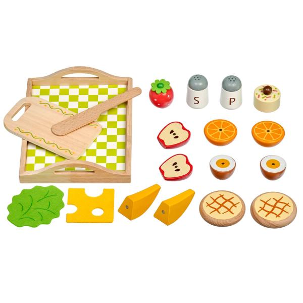 Snídaně na podnose je dřevěná herní sada věrně napodobující bohaté snídaně. Jednotlivé dílky potravin jsou spojeny magnetem a lze je jednoduše krájet přiloženým nožem na dřevěné desce. Dřevěné potraviny rozvíjejí vnímání tvarů, napodobování činnosti dospělých a fantazii. Samotné krájení podporuje rozvoj jemné motoriky. Balení obsahuje: 1 dřevěná prkénko na krájení, 1 dřevěný nůž, slánku a pepřenku, 7 kusů dřevěných potravin na krájení: 1x houska na krájení (2 poloviny), 1x sýr, 1x list salátu, 1x vejce na krájení (2 poloviny), 1x banán na krájení (2 poloviny), 1x jablko na krájení (2 poloviny), 1x pomeranč na krájení (2 poloviny), 1x jahoda, 1x dort. Délka podnosu 24 cm, šířka 18 cm, výška 2 cm. Délka prkénka na krájení 15 cm. Průměr slánky a kořenky 4 cm. Průměry jídla a ovoce od cca 4 cm do cca 7 cm. Všechny díly jsou vyrobeny z kvalitního dřeva, plátek salátu a sýra je vyroben z látky, plsti.