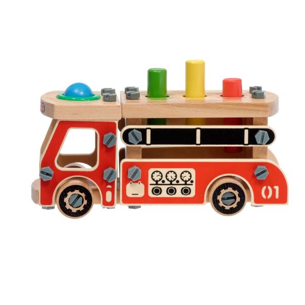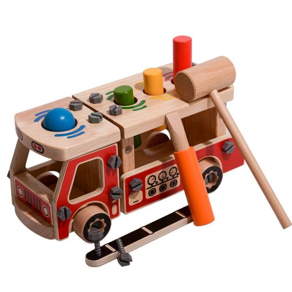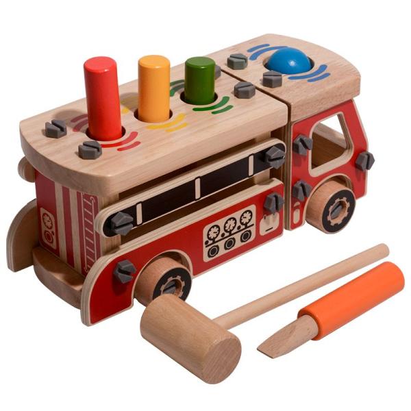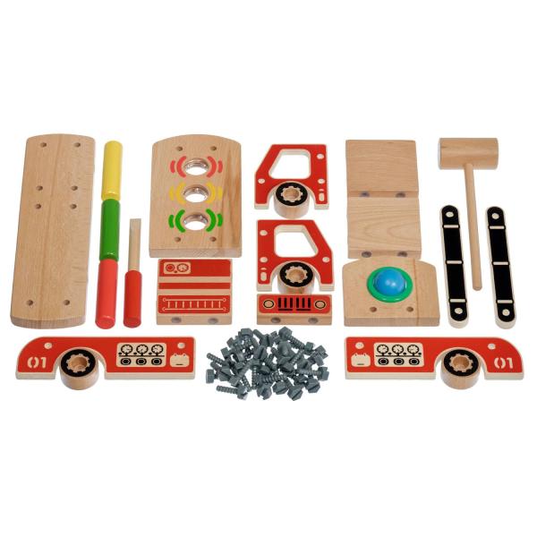 Dřevěná konstrukční sada Hasiči zaujme především kluky. Sada obsahuje řadu dřevěných dílů, šroubů a nářadí pro montáž, plus kladívko a 4 zatloukací dřevěné prvky. Po sestavení a sešroubování všech dřevěných dílů získá malý stavitel krásné hasičské auto, které má na střeše korby a návěsu navíc čtyři otvory určené k zatloukání jednotlivých zatloukacích prvků. Kromě jemné motoriky se dítě při hře s touto hračkou naučí rozlišovat tvary a barvy, trénovat paměť, pozornost a trpělivost. Balení obsahuje 17 dřevěných dílů pro sestavení auta, mnoho šroubů, 1 šroubovák, 3 barevné kolíky a 1 kouli na zatloukání a kladívko. Tato hračka je označována jako Montessori pomůcka Pro děti od 3 let