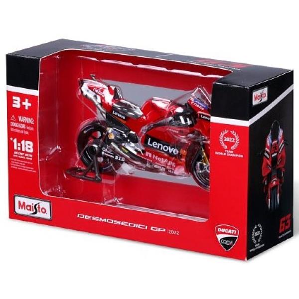 Ducati Lenovo tým 2022, (#43 Jack Miller). Model motocyklu v měřítku 1:18 vyroben z kovových a plastových dílů. Motocykl je zabalen v papírové krabičce s fóliovým průhledem. Otočná řidítka, odpružená zadní vidlice. Rozměr balení: 17,1×10,5x7cm. Věk: 3+