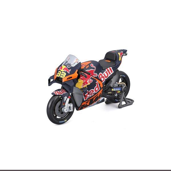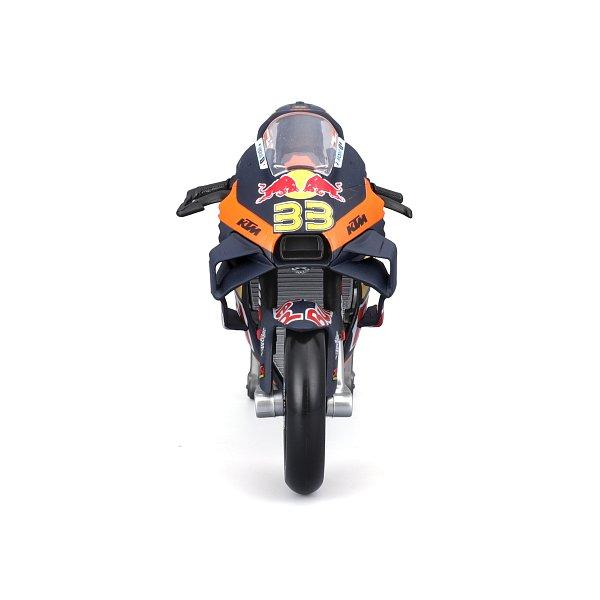 Motocykl GP Racing 1:18 Red Bull KTM Factory Racing 2023, #33 Brad Binder. Model oficiálně licencovaného závodního týmu má velmi dokonalé, detailní provedení jednotlivých částí a kvalitní barevné provedení. Kovový model s plastovými detaily. Model má volně se otáčející kola a je včetně podpůrného stojanu. Balené v krabičce. Nevhodné pro děti do 3 let. Rozměry balení: 10,5 x 17,1 x 7 cm. Věk: 3+