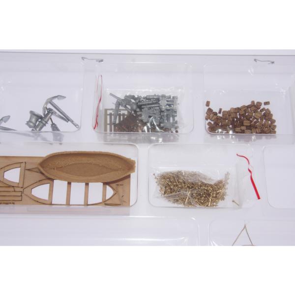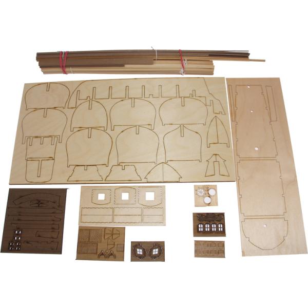 Po otevření víka krabice naleznete dřevěné díly modelu z překližky, sadu lišt, drobné součásti uzavřené v plastovém průhledném blistru, sadu výkresů a manuál.