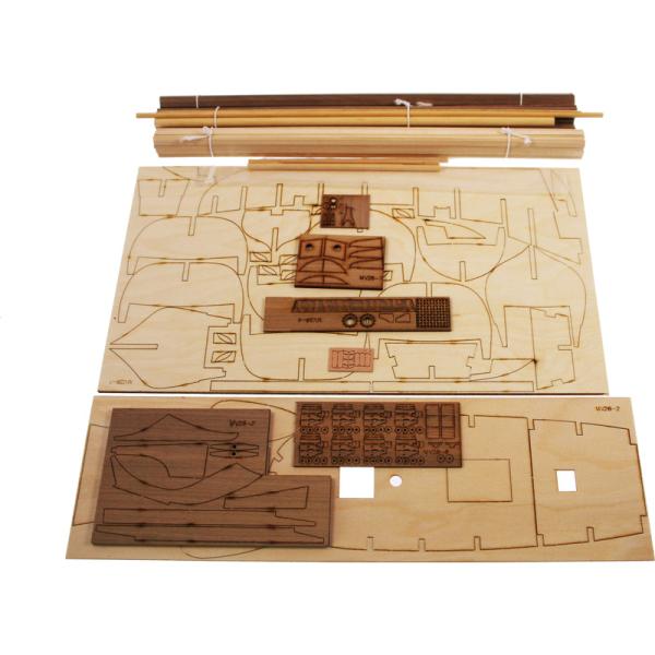 Po otevření víka krabice naleznete dřevěné díly modelu z překližky, sadu lišt, drobné součásti uzavřené v plastovém průhledném blistru, sadu výkresů a manuál.