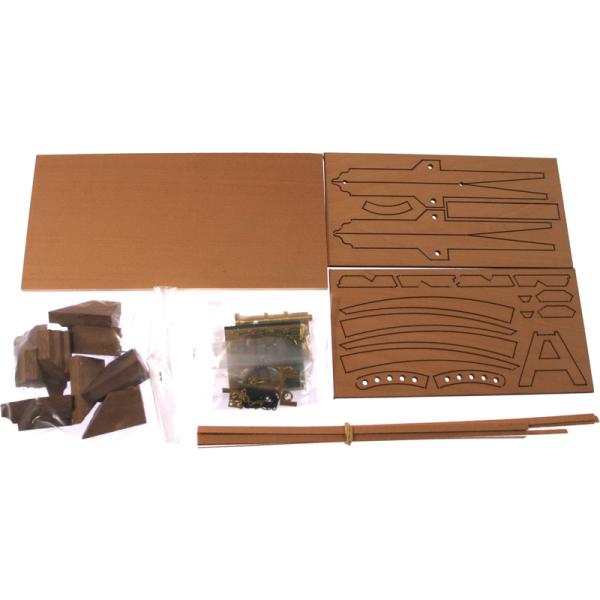 Po otevření víka krabice naleznete dřevěné díly modelu z překližky, lišty, drobné součásti v plastových sáčcích a manuál.