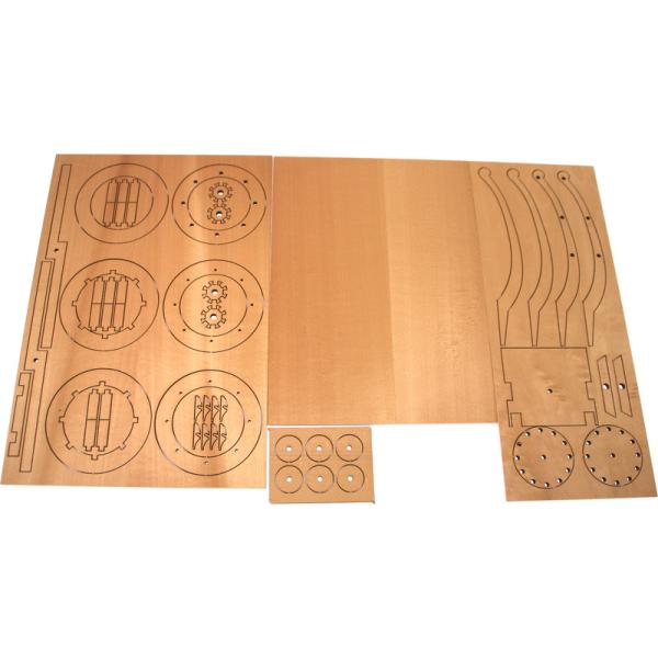 Po otevření víka krabice naleznete dřevěné díly modelu z překližky, lišty, drobné součásti v plastových sáčcích a manuál.
