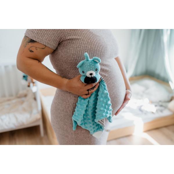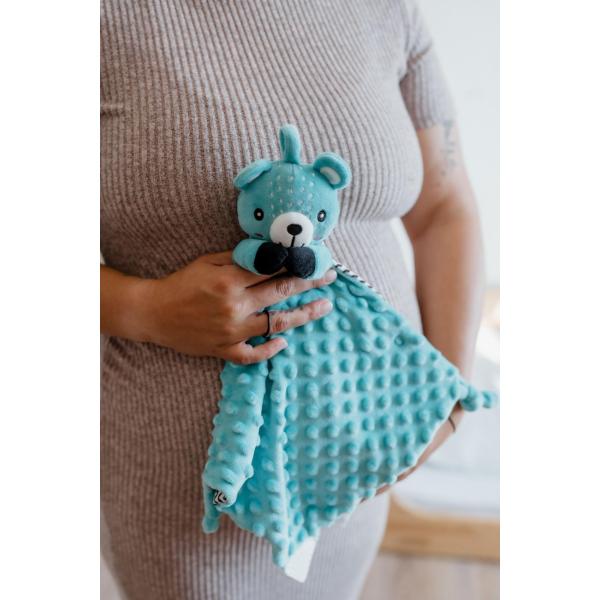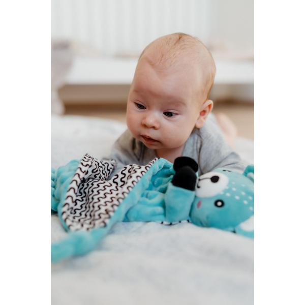 Vyrobený z měkkého minky materiálu s 3D tečkami přináší pocit bezpečí, komfortu a pomáhá uklidnit při usínání. Uvnitř medvídka je ukrytá jemná chrastítko, která podporuje sluchový rozvoj dítěte a přirozeně upoutává pozornost. Na jednom z rohů je umístěno měkké silikonové kousátko, které uleví citlivým dásním při prořezávání zoubků. Uzlíky na rozích jsou snadno uchopitelné i pro malé ručičky a podporují hmatovou stimulaci.