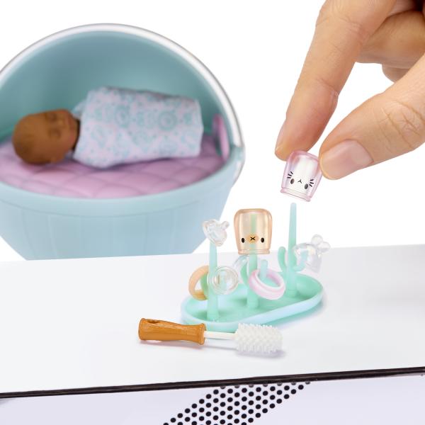 Nakrmte zábavu – jedno sousto miminka po druhém! MGA Miniverse™ Make it Mini Real Baby™ přináší radost z péče o miminko do světa sběratelských minifigurek. Rozmixujte dětskou výživu, připravujte lahvičky, čistěte nádobí a starejte se o své vzácné malé zlatíčko! Od rozmačkaného jablečného pyré až po nakrájené avokádo a vajíčka, každý malý okamžik je stvořen k tomu, aby vám roztopil srdce.