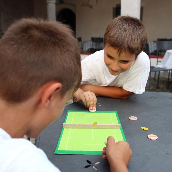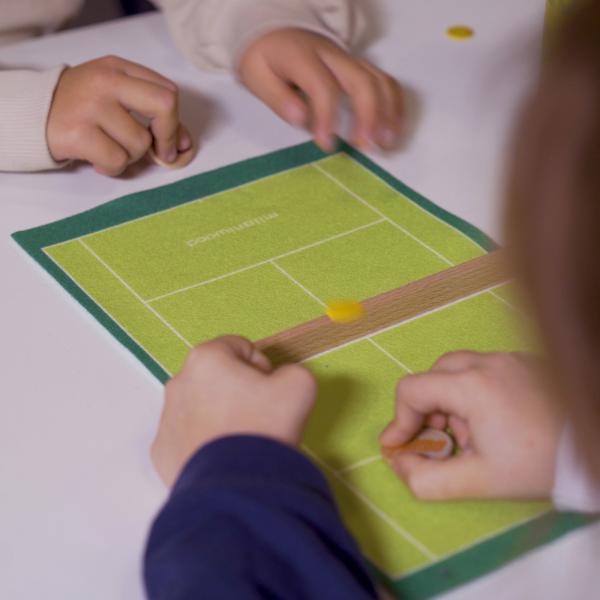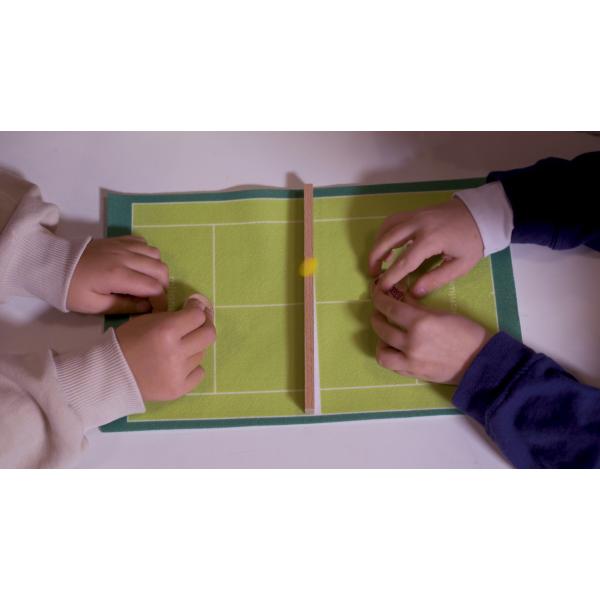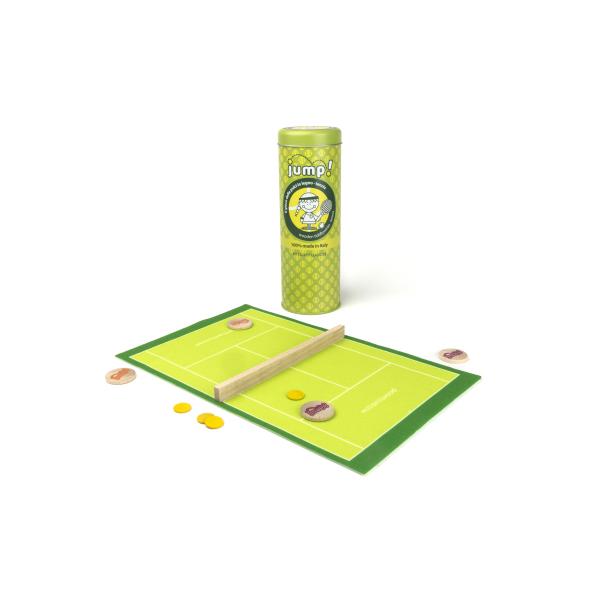 Hrajte tenis s dřevěnými žetony. Dejte vítězný úder! Skok! Tenis je skvělá zábava pro všechny věkové kategorie. Nejprve sestavte hřiště a nastavte čas zápasu na minimálně 3 minuty. Začíná nejmladší hráč. Kotoučem jemně zatlačte na žlutý kotouč tak, aby vyskočil dopředu. Podávejte tak, aby míč dopadl kamkoliv na soupeřovu polovinu. Máte 2 možnosti. Pokud při podání trefíte síť a míček dopadne na soupeřovu polovinu, opakujte podání. Pokud však během hry trefíte síť, ale míč se dostane do správné oblasti, pokračujte ve hře, dokud jeden hráč nezíská bod. Vítězem se stává hráč, který v nastaveném čase získá nejvíce bodů.