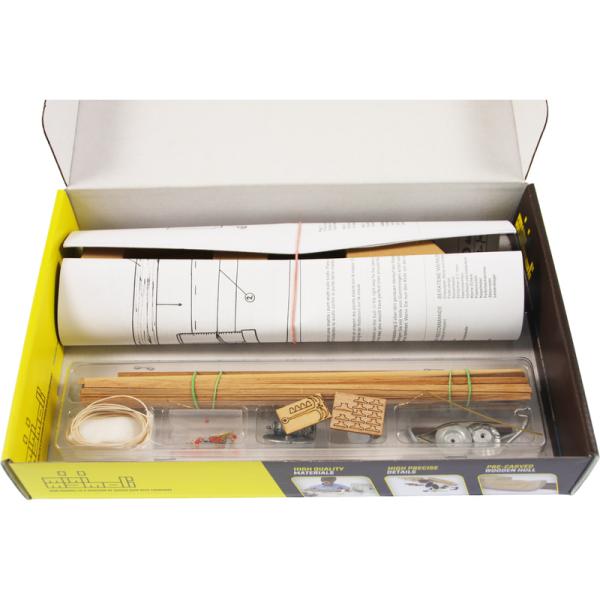 Po otevření víka krabice naleznete dřevěné díly modelu, drobné součásti uzavřené v plastovém průhledném blistru a sadu výkresů.