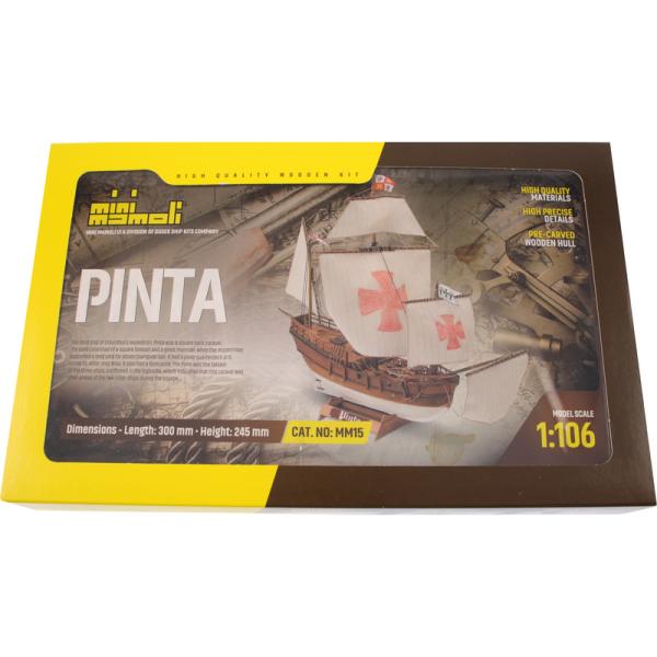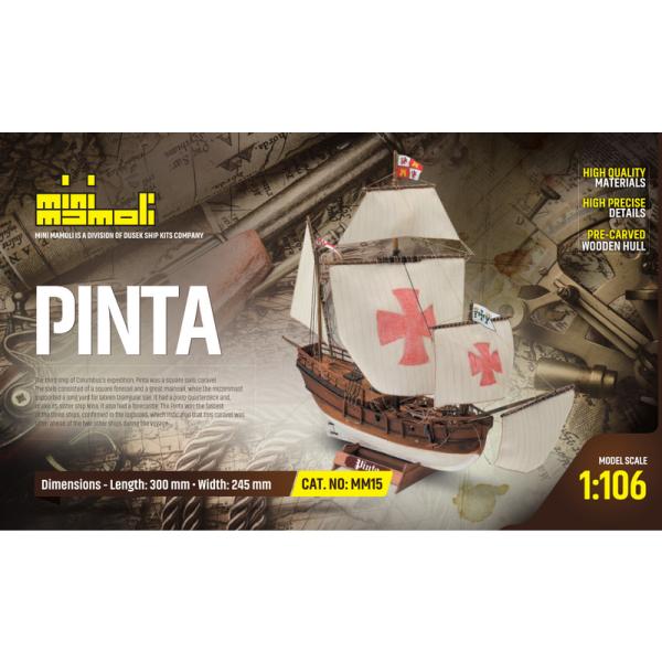 Charakteristika:Model lodi Pinta, z řady Mini Mamoli, v měřítku 1:106. Není mnoho současných záznamů o lodích Nina a Pinta. Kromě některých skrytých odkazů v záznamech Kryštof Kolumbus, italsky Cristoforo Colombo. Nicméně je známo, že obě patřily rodině Pinzonů a byly zpočátku vybaveny latexovými plachtami. Během první zastávky na Kanárských ostrovech byly v Pintě nahrazeny latinskými čtvercovými plachtami. Toto, spolu s výměnou stožáru, odložilo cestu o 4 týdny. Kolumbus vždy odkazoval na Nina a Pinta jako „Caravels“. Pak 12. října 1492 Kryštof Kolumbus, ve službách Španělska, vztyčil španělskou vlajku na ostrově, který již není pro Evropu neznámý.