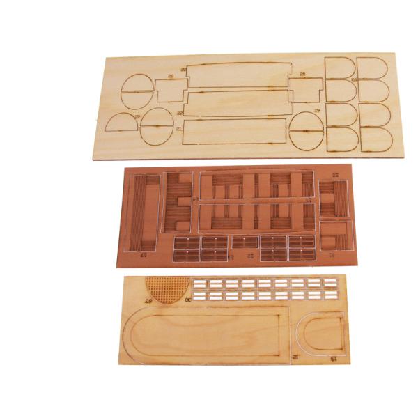 Po otevření víka krabice naleznete dřevěné díly modelu z překližky, sadu lišt, drobné součásti uzavřené v plastovém průhledném blistru, sadu výkresů a manuál.