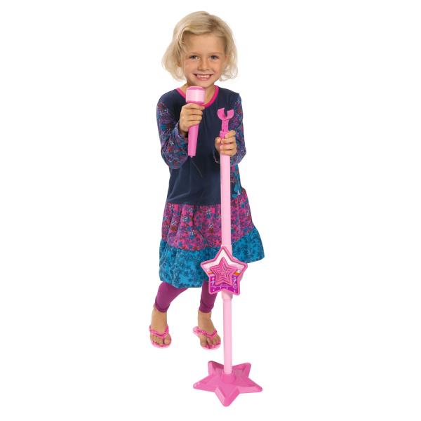 Růžový elektronický mikrofon se stojanem a se vstupem pro MP3. Nastavitelná výška 85-115cm.