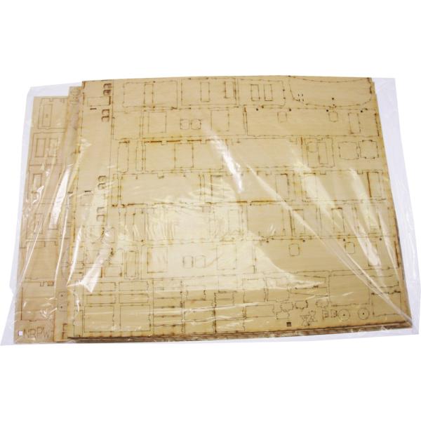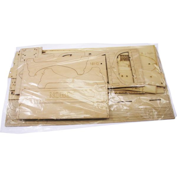 Po otevření víka krabice naleznete dřevěné díly modelu z překližky, sadu lišt, drobné součásti uzavřené v sáčcích, sadu výkresů a manuál.