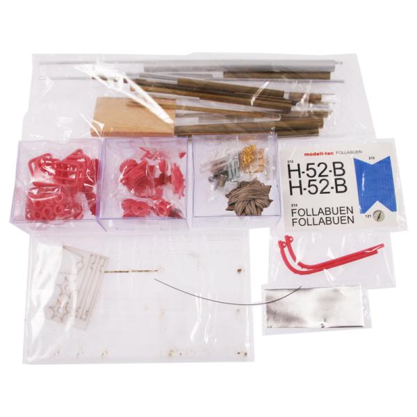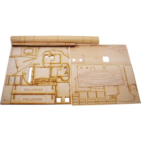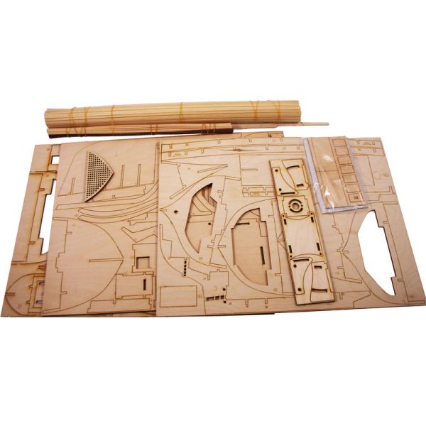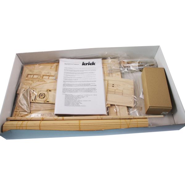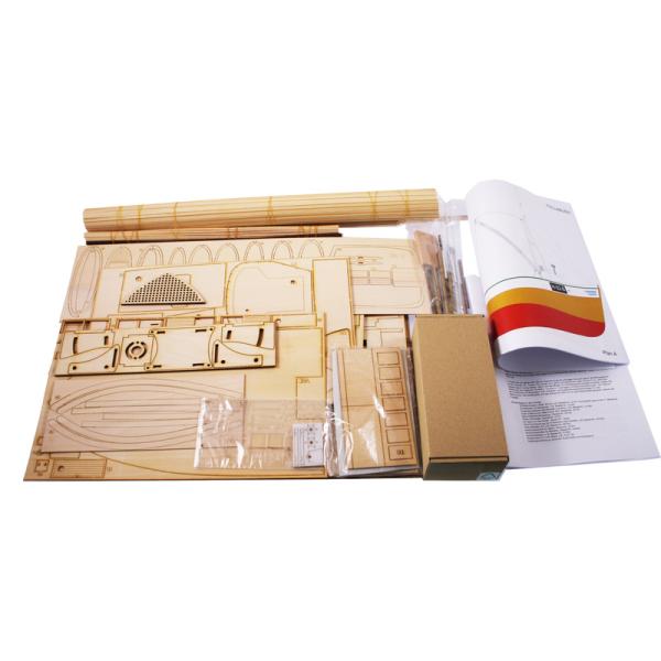 Po otevření víka krabice naleznete dřevěné díly modelu z překližky, sadu lišt, drobné součásti uzavřené v plastovém průhledném blistru, sadu výkresů a manuál.