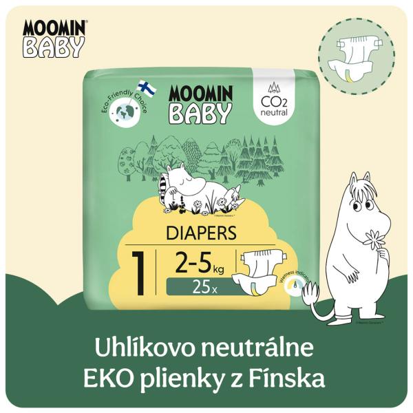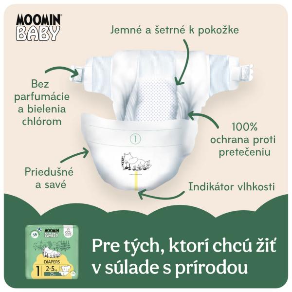 Citlivá pokožka novorozenců vyžaduje obzvlášť šetrné pleny – proto jsou tu Moomin Baby 1 Newborn, které jsou k dětské pokožce maximálně šetrné, bezpečné, extrémně spolehlivé, a navíc se speciálním střihem, díky kterému je chráněn pupek novorozených miminek. Pleny jsou hypoalergenní a mají certifikát Dermatest®. Jsou vyrobeny s podílem celulózy pocházející z finských lesů a s certifikátem FSC. Celulóza je při výrobě bělená pouze kyslíkem, takže jsou vhodné i pro tu nejcitlivější pokožku.