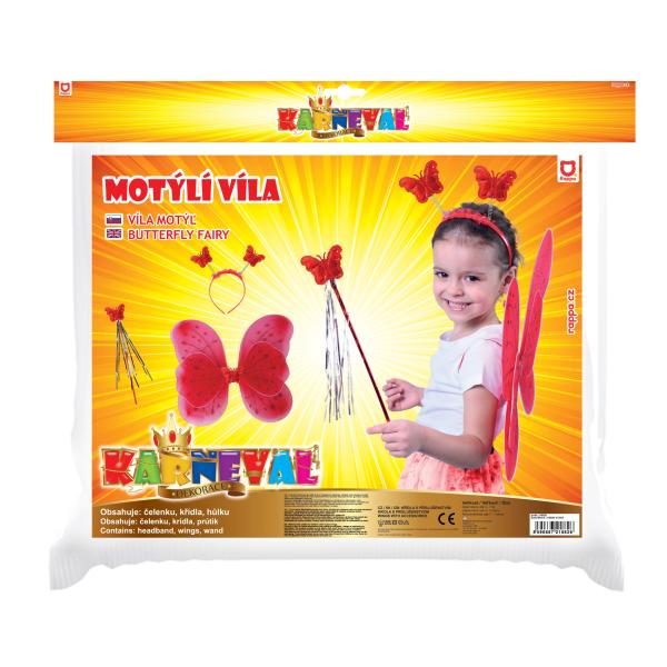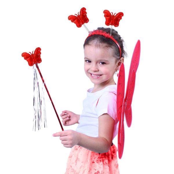 Roztomilé červené motýlí křidélka na gumičku jsou určeny pro holčičky ve věkovém rozmezí 3-10 let (104-150 cm ). Součástí této karnevalové sady je i čelenka s motýlky na pružinkách a hůlka . Věk : 3+