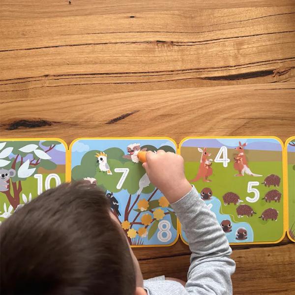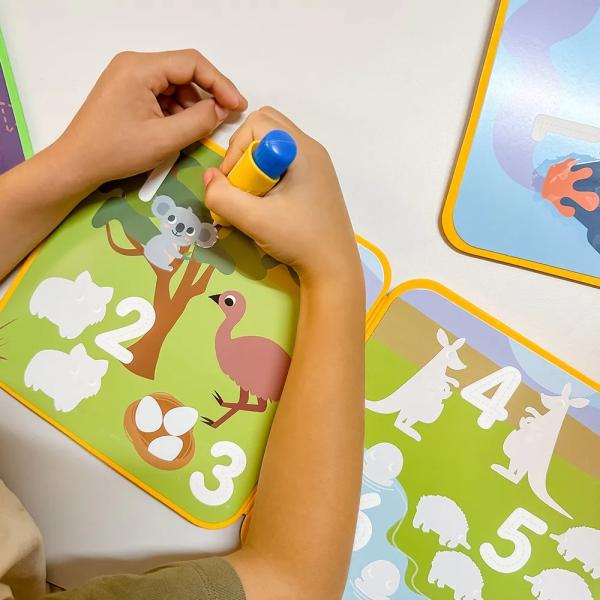 Uvolněte kreativitu kdekoliv s naším Magickým malováním vodou Zvířátka z Austrálie! Stačí naplnit přiložené vodní pero a nechat děti odhalovat barevné scény svých oblíbených australských zvířat, přičemž se hravou formou učí počítat – a to úplně bez nepořádku. Malujte vodou, sledujte, jak se barvy zázračně objeví, nechte uschnout a začněte znovu – sada je nekonečně opakovatelná!Sada je navržena tak, aby se dala rozložit a udržovala děti zabavené. Obsahuje sedm interaktivních scén, které podněcují zvědavost, podporují samostatnou hru a rozvíjejí jemnou motoriku. Perfektní na cesty autem, lety, návštěvy kaváren nebo klidné odpoledne u prarodičů!