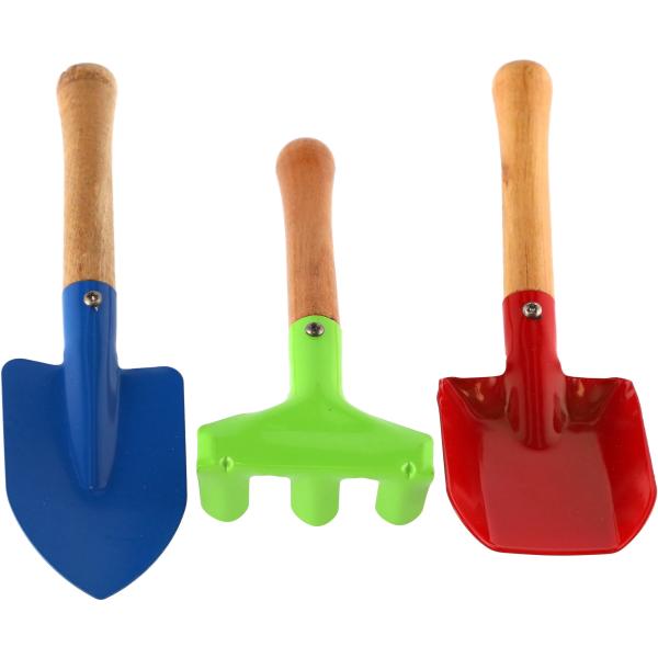 Tělo je z kovu a rukojeť je dřevěná. S tímto kvalitním nářadím mohou děti pomáhat svým rodičům při práci na zahradě nebo si hrát na písku.