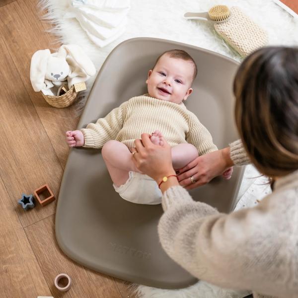 Podložka má ze spodní strany povrch připomínající strukturu včelího plástu. Hmotnost miminka stačí na to, aby se vzduch vytlačil a podložka se přisaje na plochu, jakmile miminko zvednete, vakuum se uvolní a podložku je opět snadné přesunout.