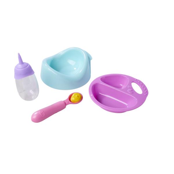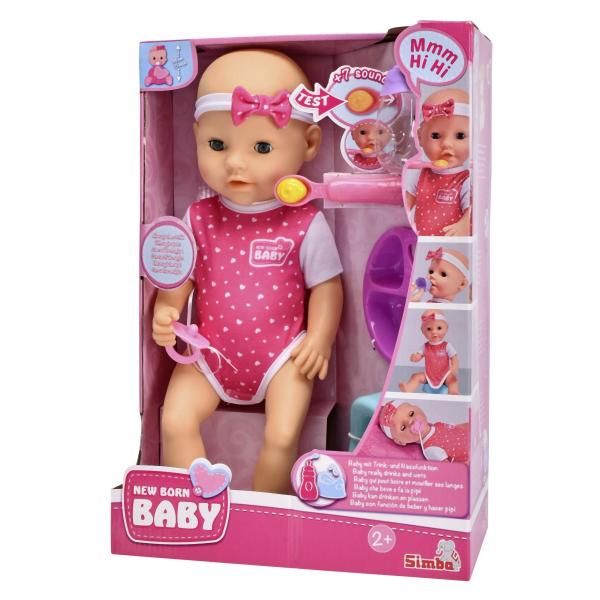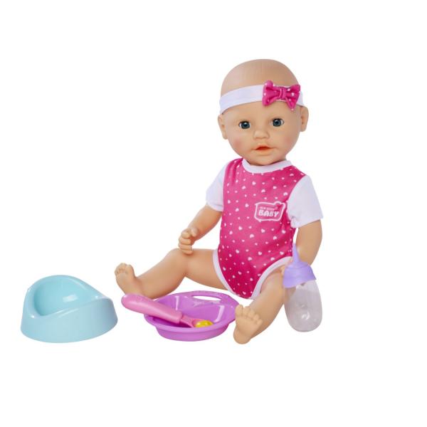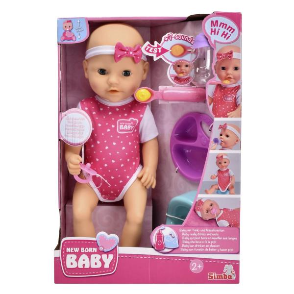 Panenka New Born Baby Hungry pije a čůrá a vydává zvuky. Balení obsahuje lahvičku, misku, kouzelnou lžičku a nočník. Výška panenky 38 cm.
