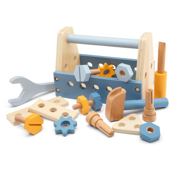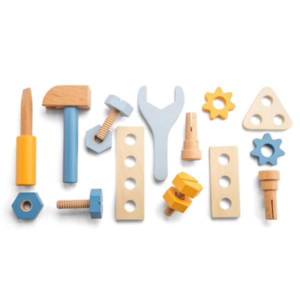Sada obsahuje 16 dílů včetně kladiva, šroubováku, klíče, hřebíků, šroubů a ozubených kol, což umožňuje množství možností pro rozvoj dovedností.