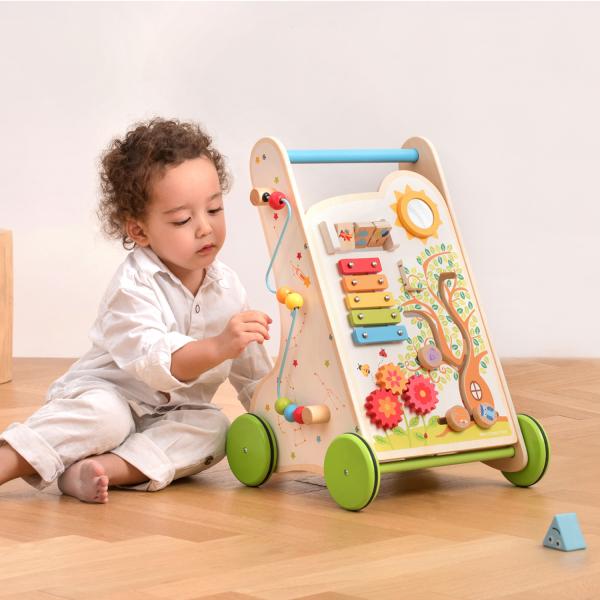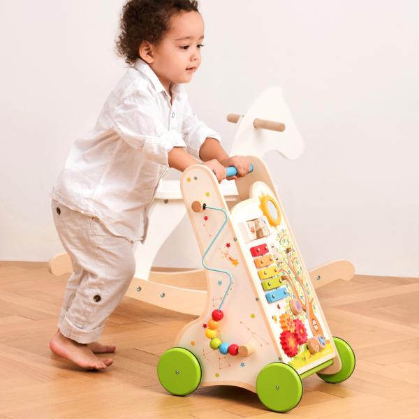 Dřevěný multifunkční chodítko je ideální pro děti, které se začínají učit chodit.