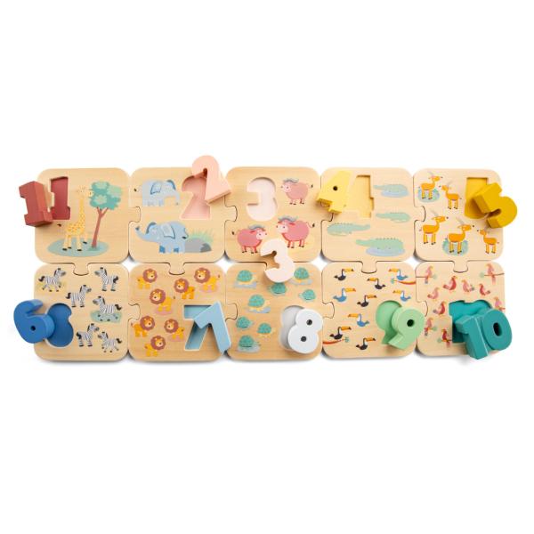 Počítejte zvířátka a složte dílky skládačky ve správném pořadí od čísla 1 do čísla 10 ve dvou řadách. Nakonec přidejte k každému dílku skládačky správné dřevěné číslo podle počtu zvířátek.Tato skládačka je ideální vzdělávací hračka pro děti od 2 let.Děti se naučí základní číslice a počítat do 10. Navíc tyto puzzle napomáhají rozvoji jemné motoriky. Balení obsahuje 10 dřevěných dílků skládačky a 10 dřevěných číslic. Rozměry hračky jsou 50 x 20 x 2 cm.