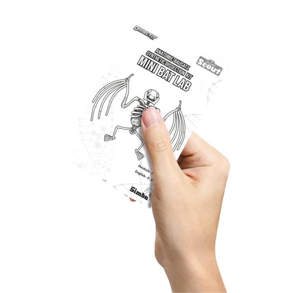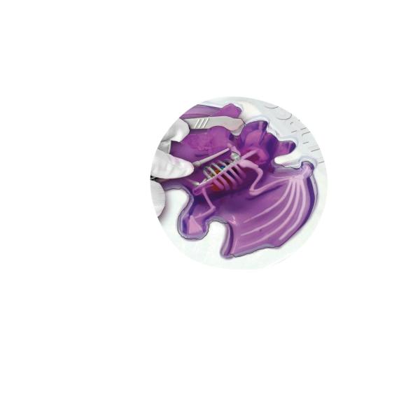 Sada s nástroji k pitvě netopýra, jehož kosti a orgány jsou pokryty fialovým slizem. Prvky lze vyjmout a prozkoumat jednotlivě. Součástí je sáček s práškem pro vytvoření nového slizu. Po dokončení první pitvy vložte orgány a kostru zpět do blistru, promíchejte prášek s vodou, zalijte vzniklým slizem a nechte ztuhnout v chladu. Netopýra pak lze pitvat podruhé. Velikost 15 cm.