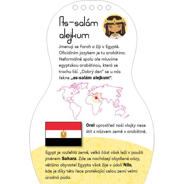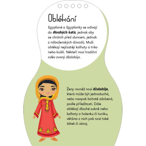 Další titul oblíbené série, která našla své obdivovatele v desítkách zemí světa, představuje malým čtenářům kouzlo Egypta prostřednictvím panenky Farah. Kreativní omalovánky, plno samolepek… knížka obsahuje vše, co je potřebné k vytvoření nespočetných modelů podle egyptské módy. A ještě k tomu všemu se děti dočtou o množství zajímavých informací navíc! Jak se jejich vrstevníci v Egyptě zdraví, jak se tam učí, na jakých specialitách si pochutnávají? Víte, co je to košarí nebo džalabíja? To, a ještě mnohem více, se dozvíte, pokud se vydáte za poznáním s našimi panenkami. A ke každé knížce dostanete krásný náramek pro štěstí!