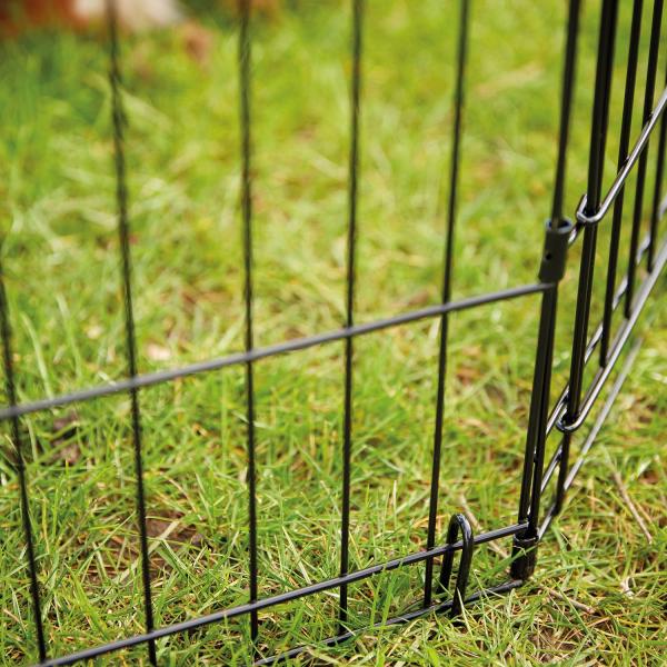Kovová ohrádka z 8 dílů s dvířky. Vhodná pro psy, hlodavce a jiná drobná domácí zvířata. Velikost každého dílu: šířka 61, výška 91 cm.