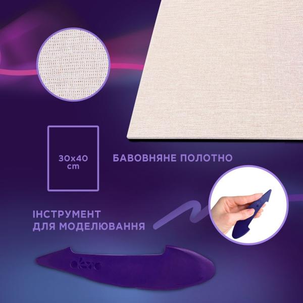 přírodní plátno, návod, dřevěný modelovací nástroj, sada hlíny (směsi).