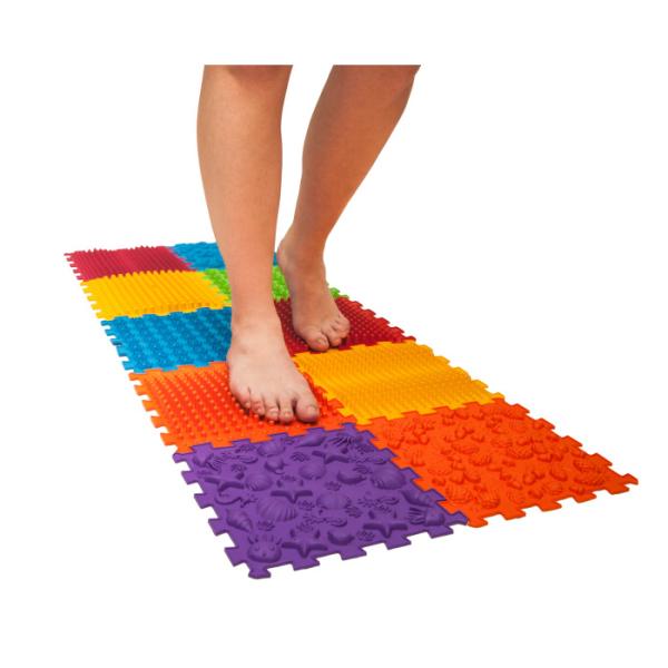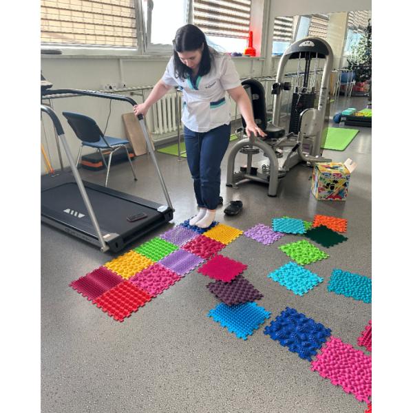 Masážní podložka se skládá z 10 modulů a je vyrobena z hygienického, hypoalergenního materiálu na bázi PVC. Rozměry modulu: 26*26 cm