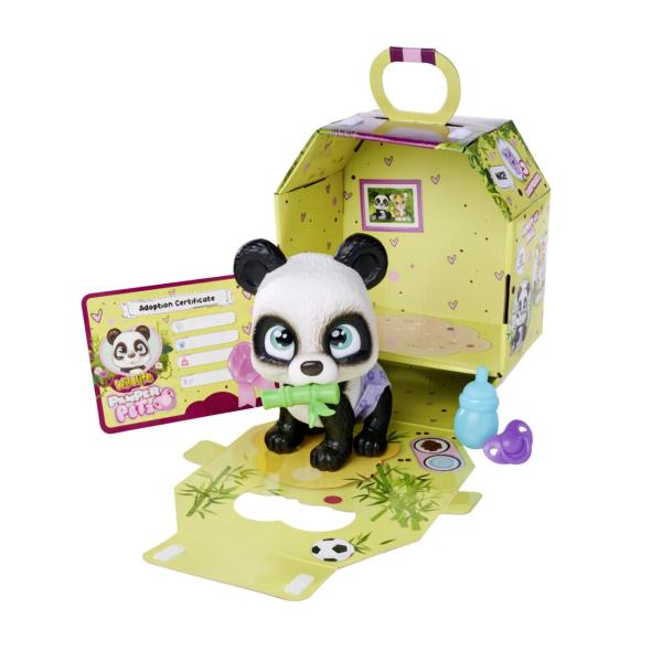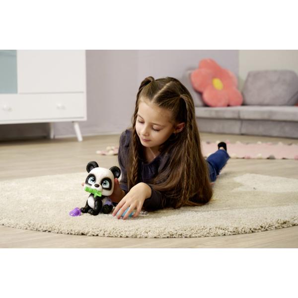 Roztomilé miminko pandy, které pije a čůrá, plenka po namočení změní barvu, magická tlapka (po navlhčení se vybarví a ukáže pohlaví pandy), adopční list a tři překvapení. Velikost 15 cm. Věk: 3+