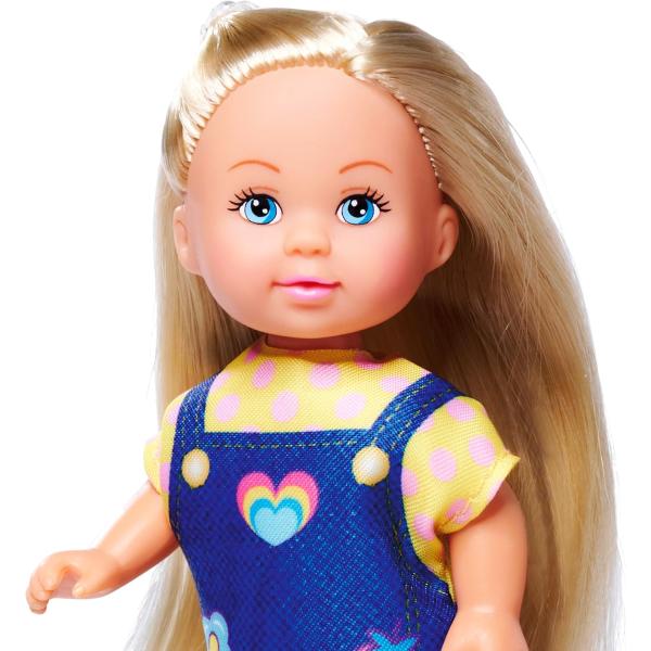 Panenka Evička oblečená v roztomilých džínsových šatech. Součástí balení jsou další dva outfity s teniskami. Velikost panenky 12cm.
