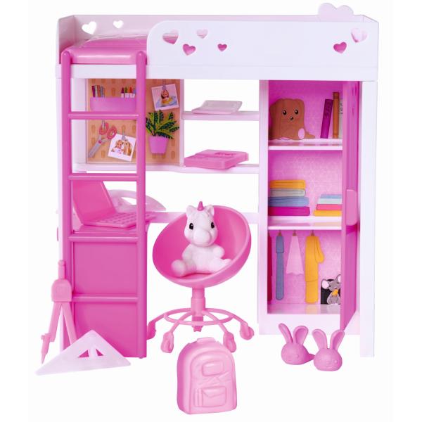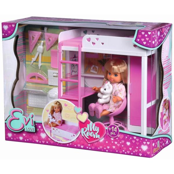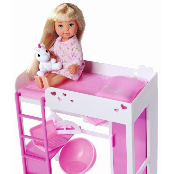 Panenka Evička s vysokou postelí, pracovním stolem, šatní skříní a dalším příslušenstvím. Výška panenky 12 cm. Věk 3+