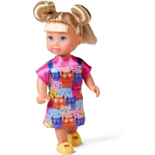 Panenka Evička oblečená v roztomilém kočičím oblečku. Součástí balení jsou dvě kočičky, škrabadlo a další doplňky. Velikost panenky 12 cm.